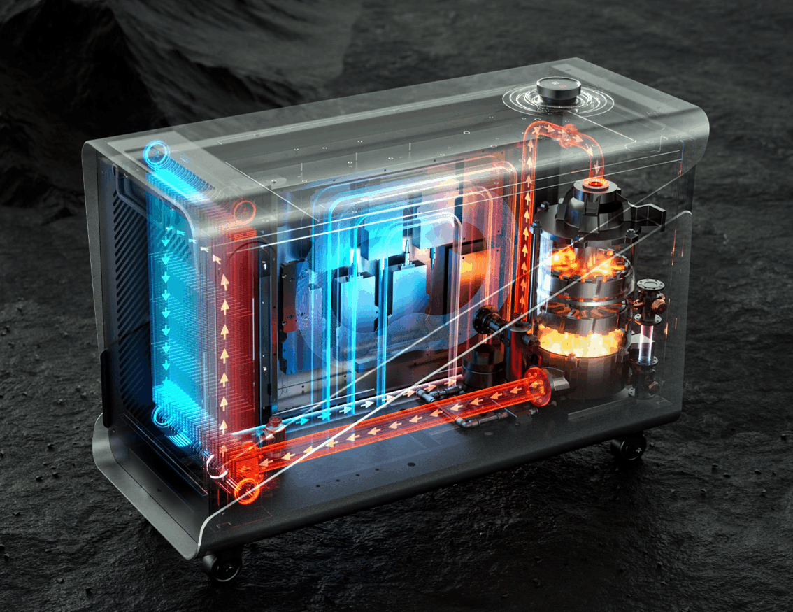 Virtalähde on varustettu kylmäaineella toimivalla jäähdytysjärjestelmällä, joka pitää sisäosat viileinä ilman pakotettua ilmavirtaa tai ulkoista vesijäähdytystä. Itsejäähdyttävä ratkaisu.